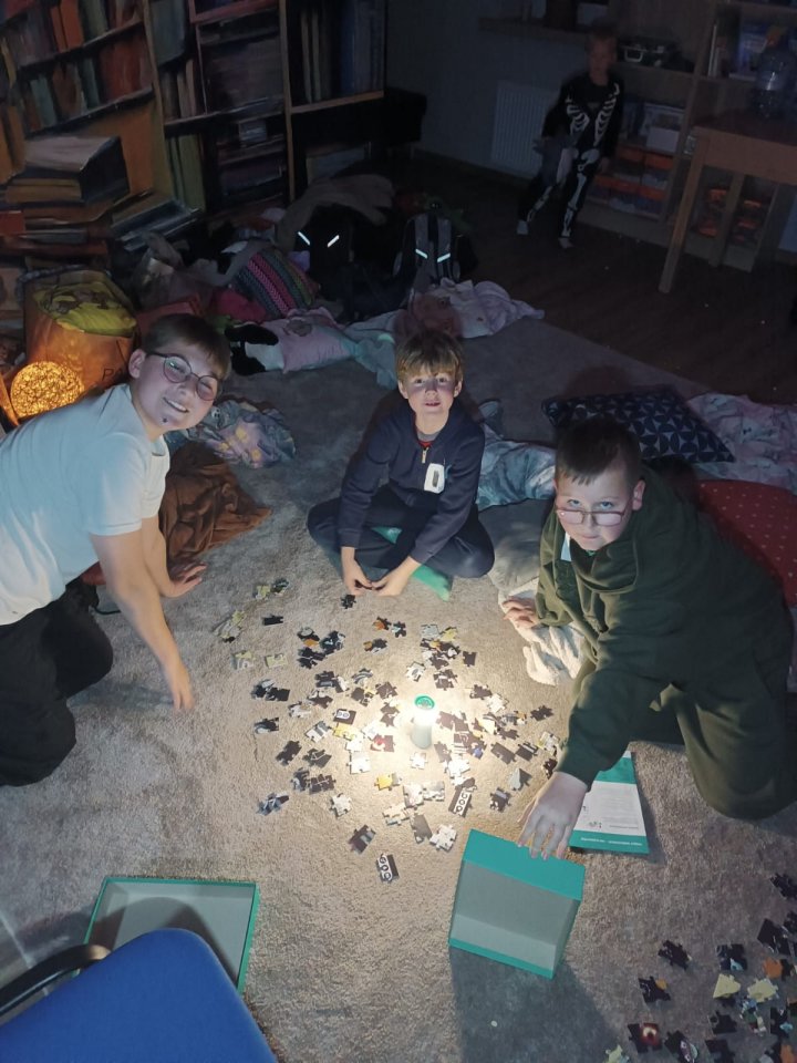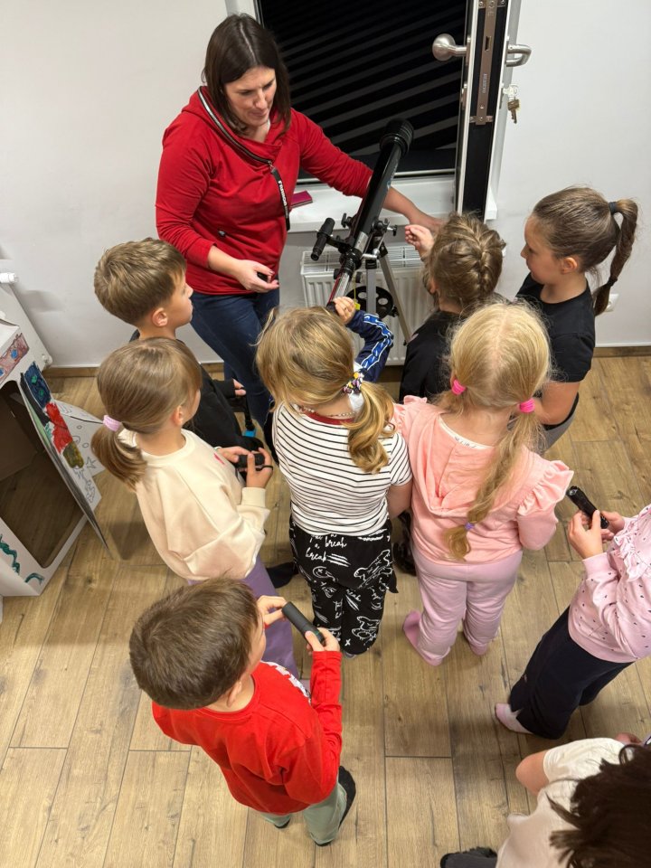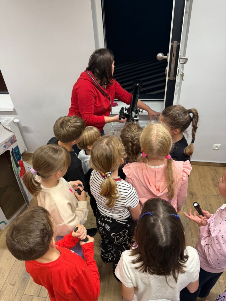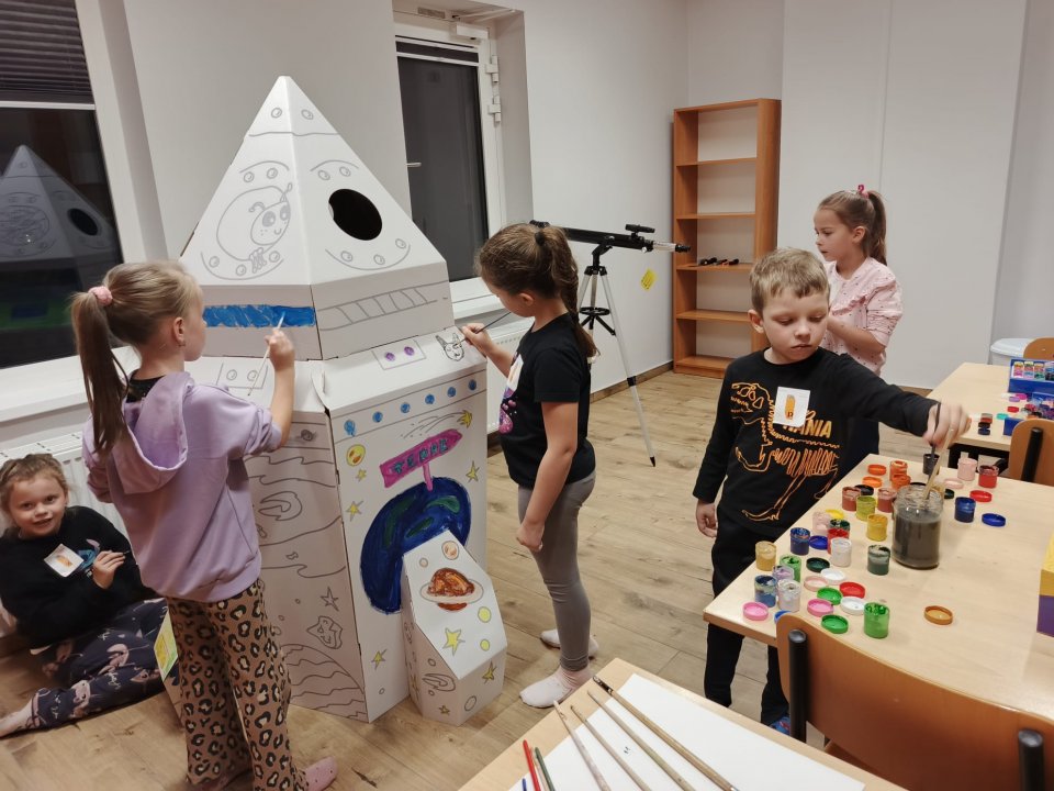 Dzieci podzielone na grupy odkrywały kosmiczne tajemnice ukryte w czterech pomieszczeniach....
